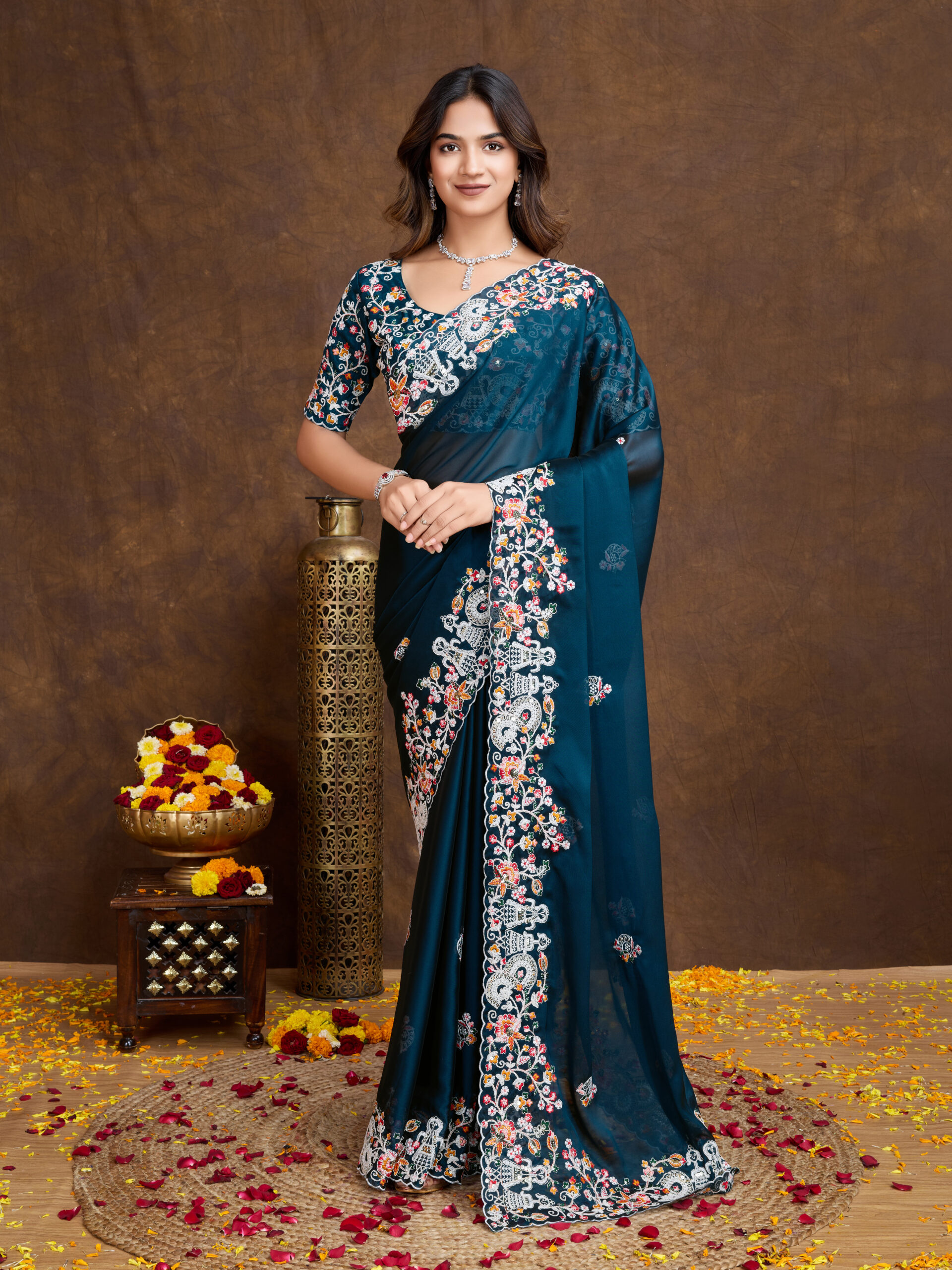 Sofisty Women’s Embroidered Rangoli Silk Sari with Blouse | Ethnic Wear for Special Occasions (Teal)