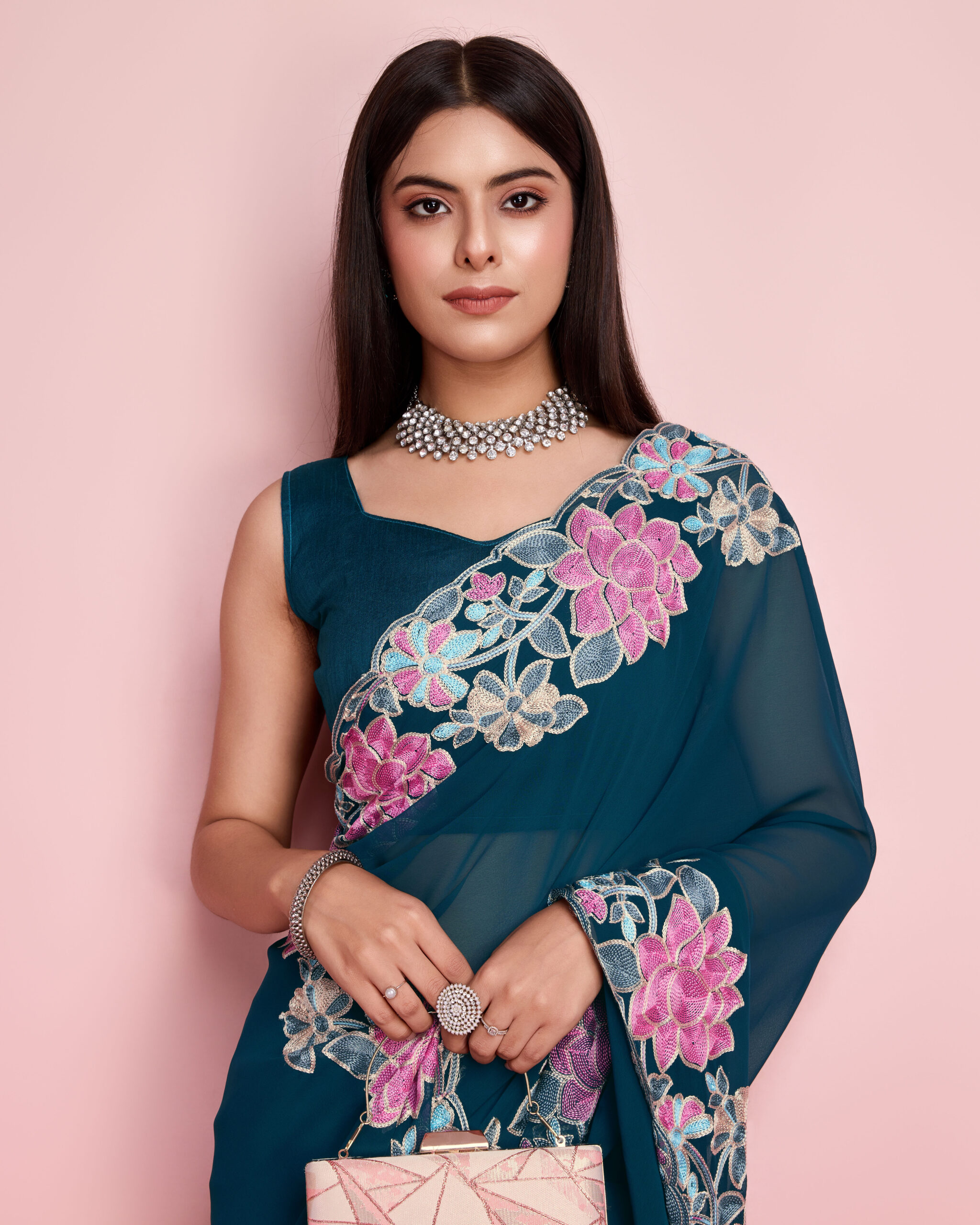 Embrace elegance with the Sofisty Women’s Aari Embroidery Soft Georgette Ready-to-Wear Saree. This beautifully designed saree is tailored for the modern woman who appreciates both style and convenience. Made from premium soft georgette fabric, it offers a luxurious drape with a lightweight feel that keeps you comfortable throughout the day or evening.
