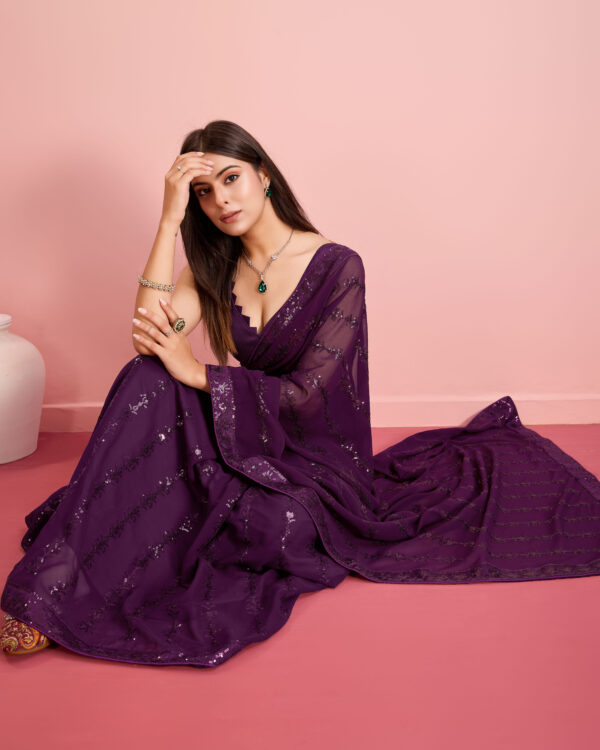 Step into elegance with the Sofisty Women’s Sequences Embroidery Soft Georgette Ready-to-Wear Saree with Lace Border. Designed for the modern woman, this saree combines beauty and convenience. The high-quality soft georgette fabric provides a lightweight, comfortable drape that flows effortlessly, making it perfect for all-day wear during celebrations and parties.