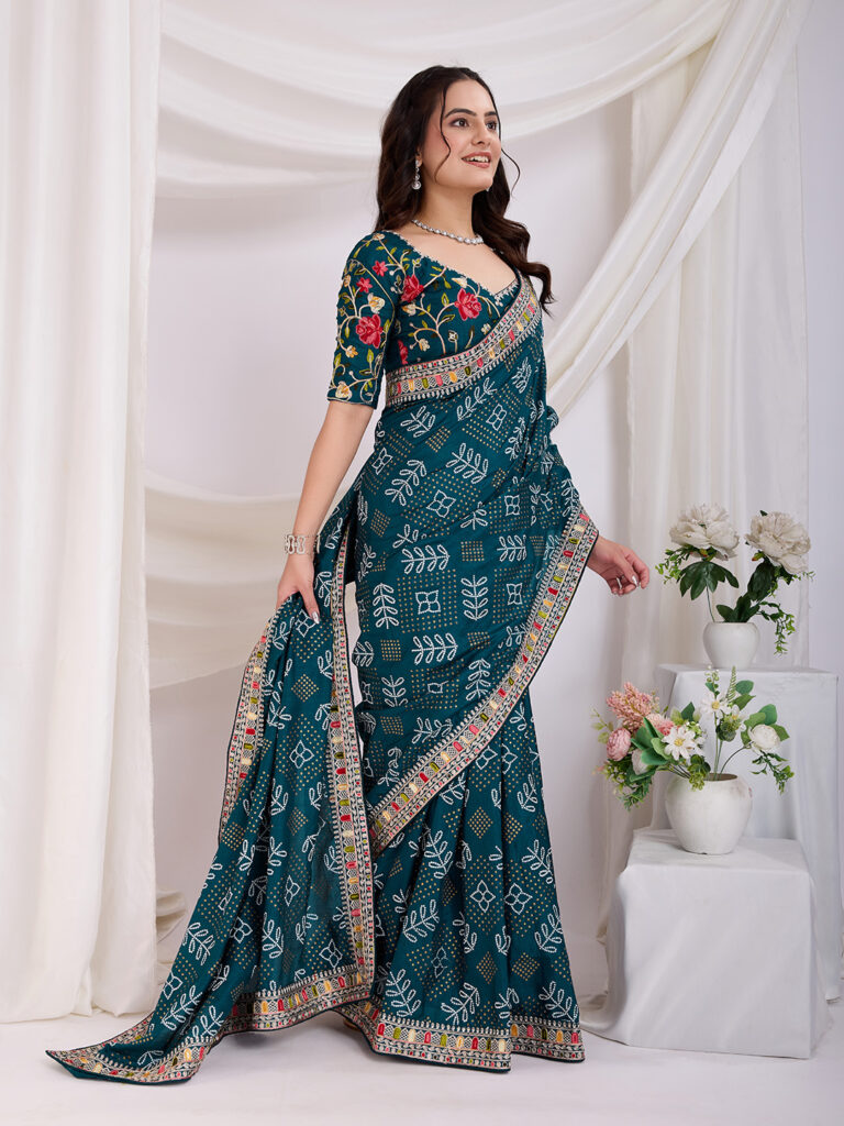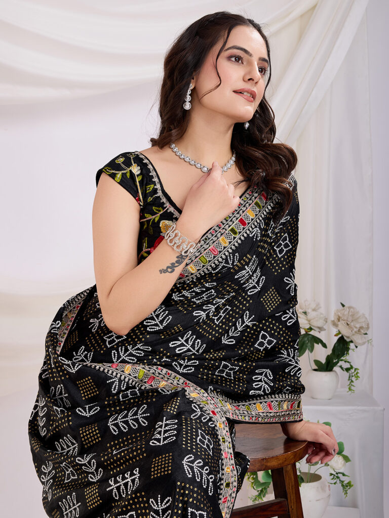 ✨ Sofisty Women’s Vichitra Silk Saree – Bandhani Print with Aari Embroidered Lace Border ✨